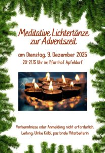 Meditative Lichtertänze zur Adventszeit, am 09.12.2025 (20-21:15 Uhr) im Pfarrhof Apfeldorfhttps://www.apfeldorf.de/wp-content/themes/movedo/images/empty/thumbnail.jpg150150Gemeinde ApfeldorfGemeinde Apfeldorf//www.apfeldorf.de/wp-content/uploads/2020/11/logo-web-apfeldorf.jpg